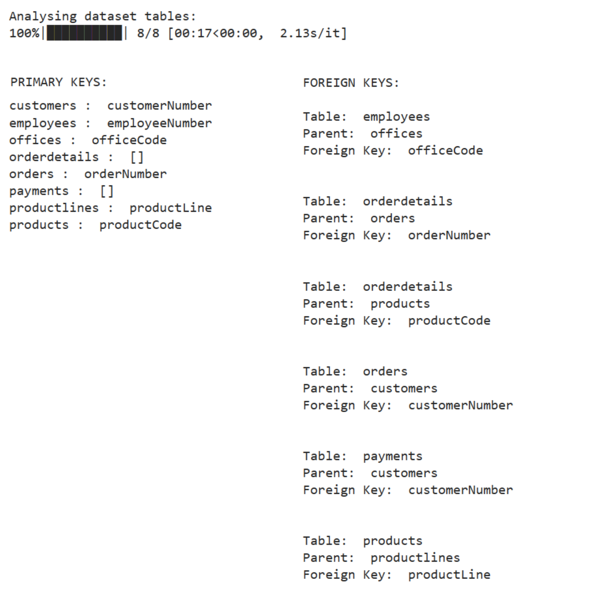 Our relationship discovery algorithms can automatically identify these keys and infer the relationships between tables. This module uses named entity recognition and data profiling algorithms to perform this step. The accuracy is, of course, not 100%, so we provide the user with the possibility of editing and correcting it. The output for the database shown in the figure above is, for example, the following output: