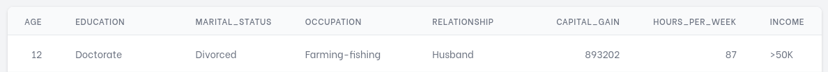 If you generate synthetic data with a procedure that does not correctly capture the distributional properties for the well-known UCI Adult dataset you may get this particular instance among your new data: