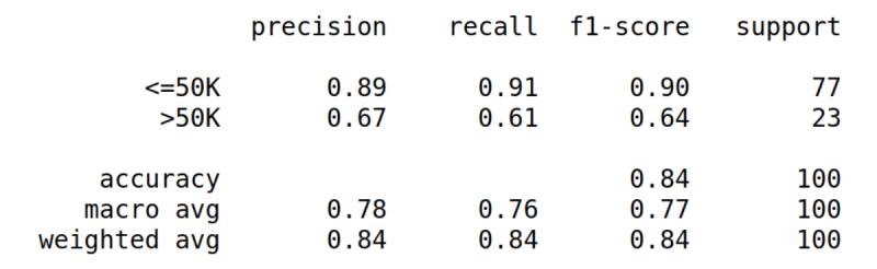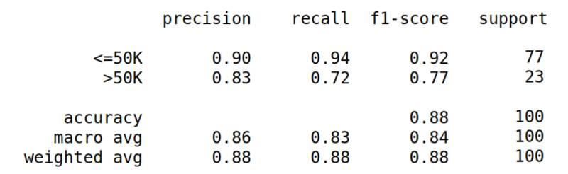 Let's start with the familiar UCI Adult dataset. I simulated a data scarcity situation by sampling from the original dataset a training set of 500 rows and a validation set of 100 rows. We train a simple Decision Tree on this reduced training set and obtain the following metrics on the original validation set: