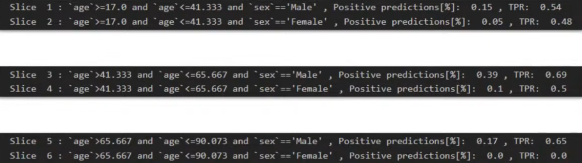 In this case, the model has to predict the income of a certain individual. Once we distinguish the data slices that are useful for us and make the predictions, we can see that the TPR (True Positive Rate) of the different clusters is much higher for men, and after the age of 65 it becomes 0 for females (image 4).