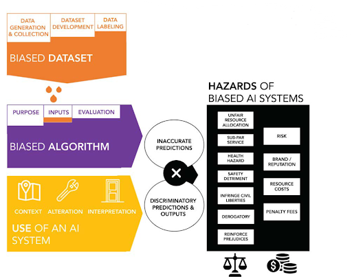 When we think of a machine learning pipeline process, bias can originate from the dataset collection phase, its development and labeling. Then, the data feeds into the model and the outputs will also be influenced by the way we build the models, for example in terms of inclusion and explainability. The level of bias we should expect from a model depends on its application as well. For instance, if we use it for the production lines of a factory, bias is not necessarily a big issue. However, when the models are used to make decisions that impact people's lives, the hazards of bias are serious (see image 2).